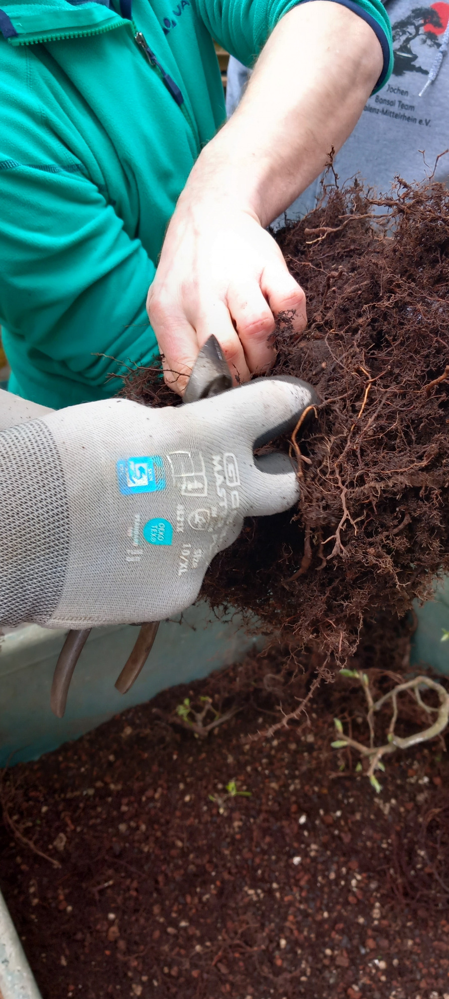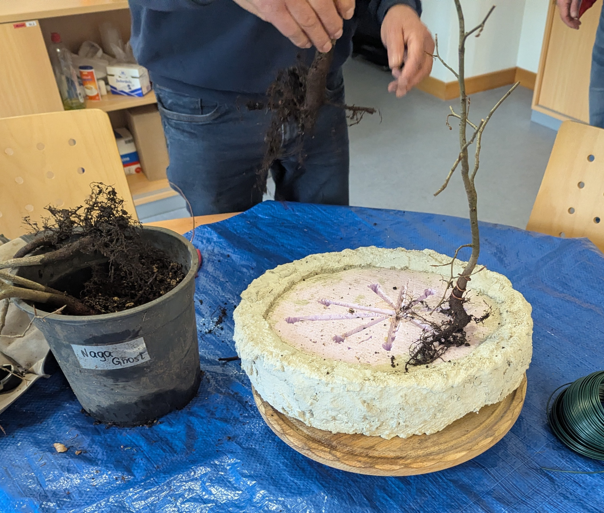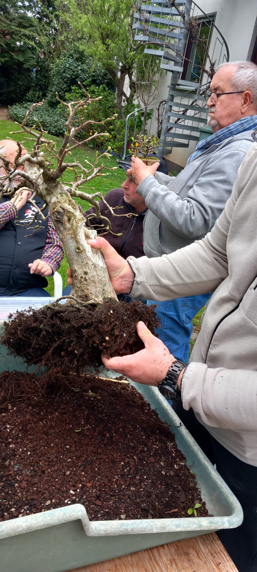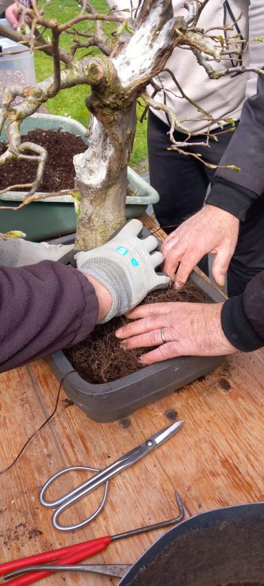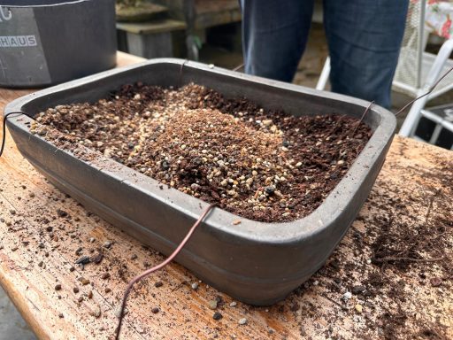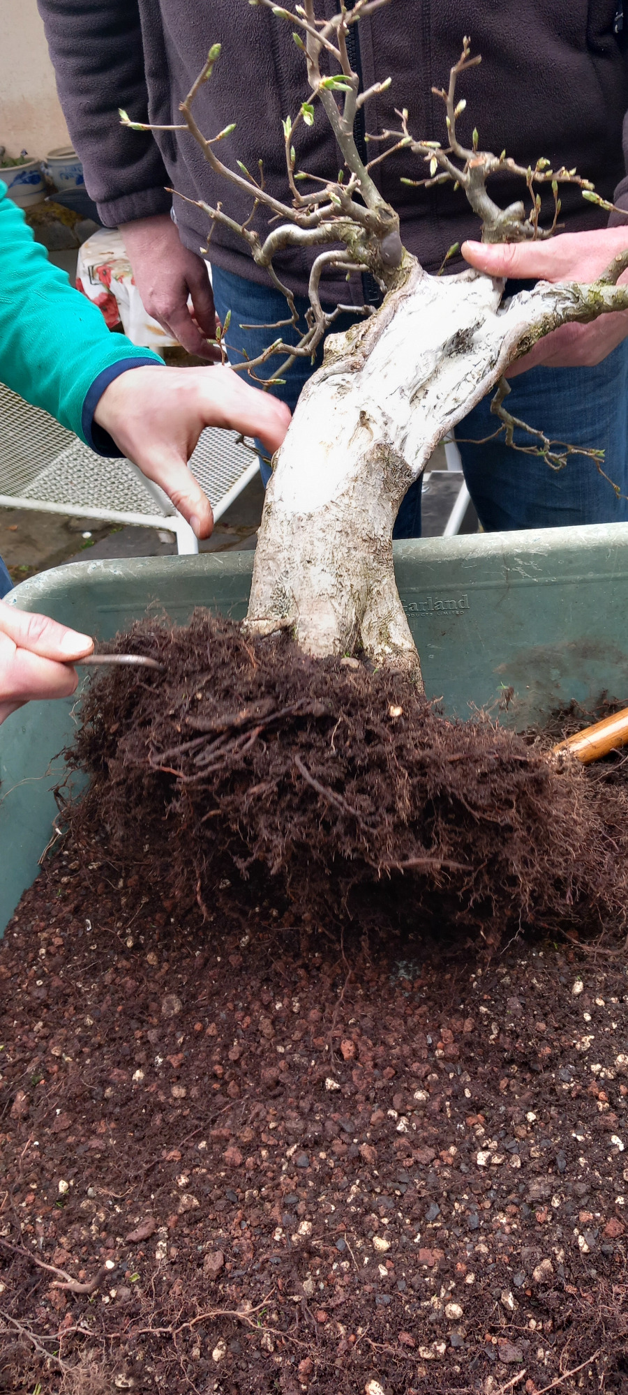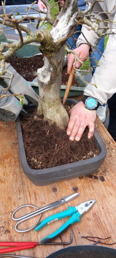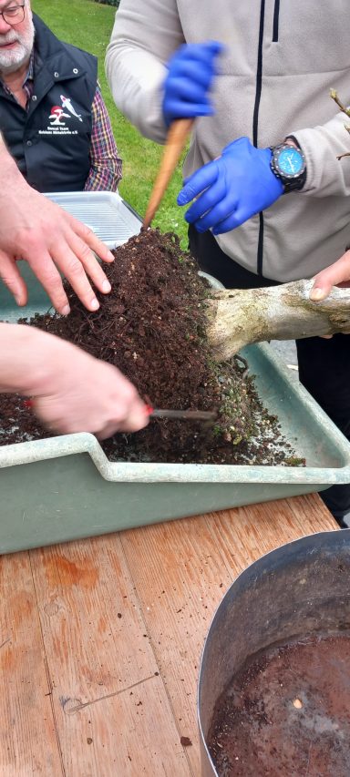 Da Egors Schale recht flach war, musste unter dem Stamm auch noch ein dicker Wurzelansatz abgeflacht werden. Die Abflusssiebe hatte Egor schon vorbereitet und so musste nur noch der Befestigungsdraht durchgezogen werden und dann wurde die Schale mit einer dünnen Schicht groben Substrats und darüber mit Feinerem aufgefüllt. Die Hainbuche wurde in die gewünschte Position gesetzt und in das Substrat reingedreht und geschoben. Dabei wurde der feste Sitz geprüft und mit weiterem Substrat an den Rändern stabilisiert. Dann wurden die Drähte verbunden und der Baum festgedrahtet. Weiteres Substrat mit Stäbchen zwischen die Wurzeln gestoßen, um mehr Dichte und Festigkeit zu erreichen, und weiter aufgefüllt, danach noch ordentlich gewässert. Das Umtopfen der großen Lärche von Wolfgang wurde aufgrund des schon stark austreibenden Baums verschoben.