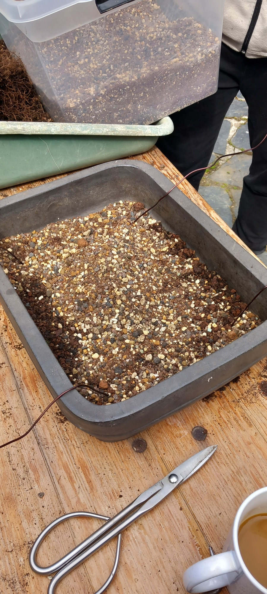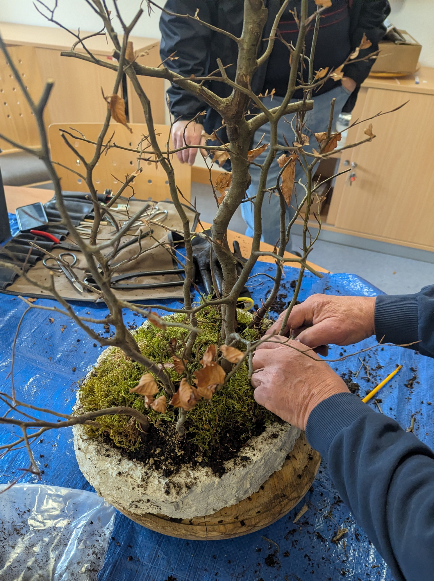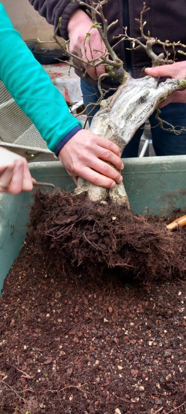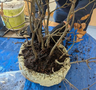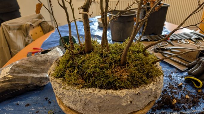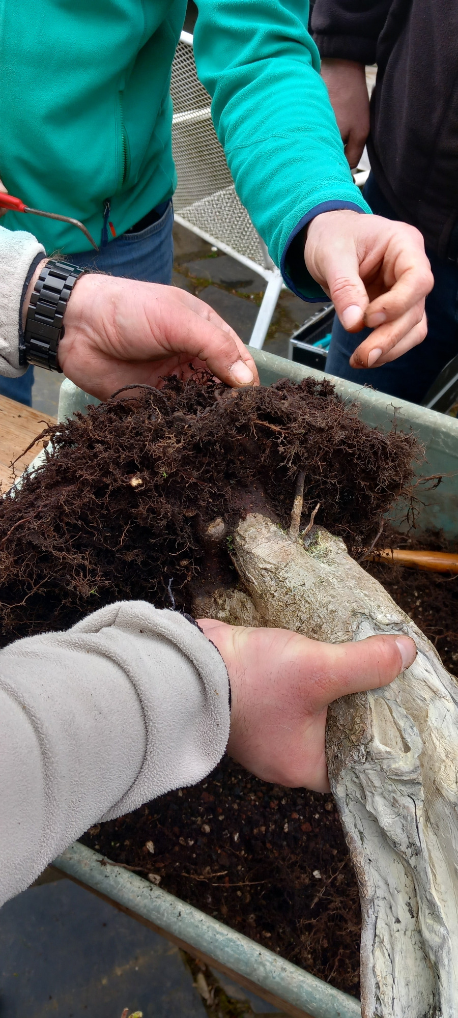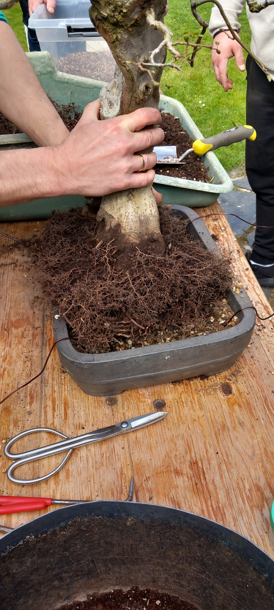 Da Egors Schale recht flach war, musste unter dem Stamm auch noch ein dicker Wurzelansatz abgeflacht werden. Die Abflusssiebe hatte Egor schon vorbereitet und so musste nur noch der Befestigungsdraht durchgezogen werden und dann wurde die Schale mit einer dünnen Schicht groben Substrats und darüber mit Feinerem aufgefüllt. Die Hainbuche wurde in die gewünschte Position gesetzt und in das Substrat reingedreht und geschoben. Dabei wurde der feste Sitz geprüft und mit weiterem Substrat an den Rändern stabilisiert. Dann wurden die Drähte verbunden und der Baum festgedrahtet. Weiteres Substrat mit Stäbchen zwischen die Wurzeln gestoßen, um mehr Dichte und Festigkeit zu erreichen, und weiter aufgefüllt, danach noch ordentlich gewässert. Das Umtopfen der großen Lärche von Wolfgang wurde aufgrund des schon stark austreibenden Baums verschoben.
