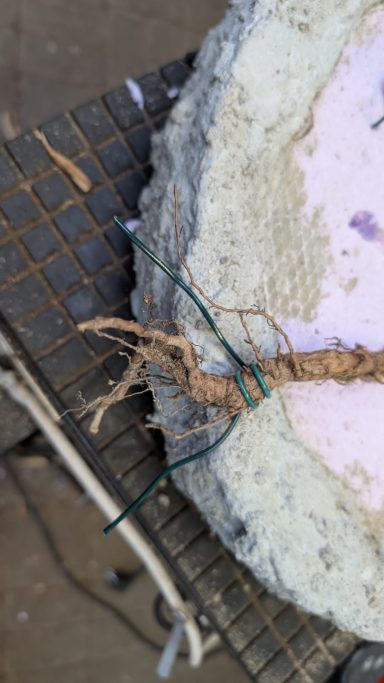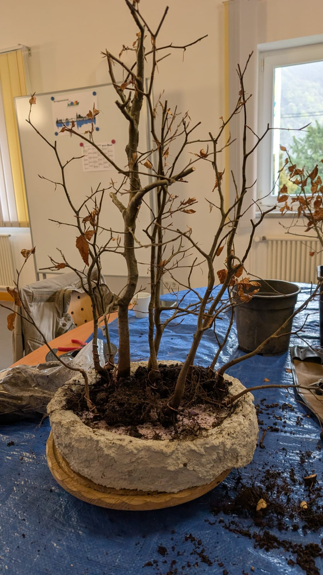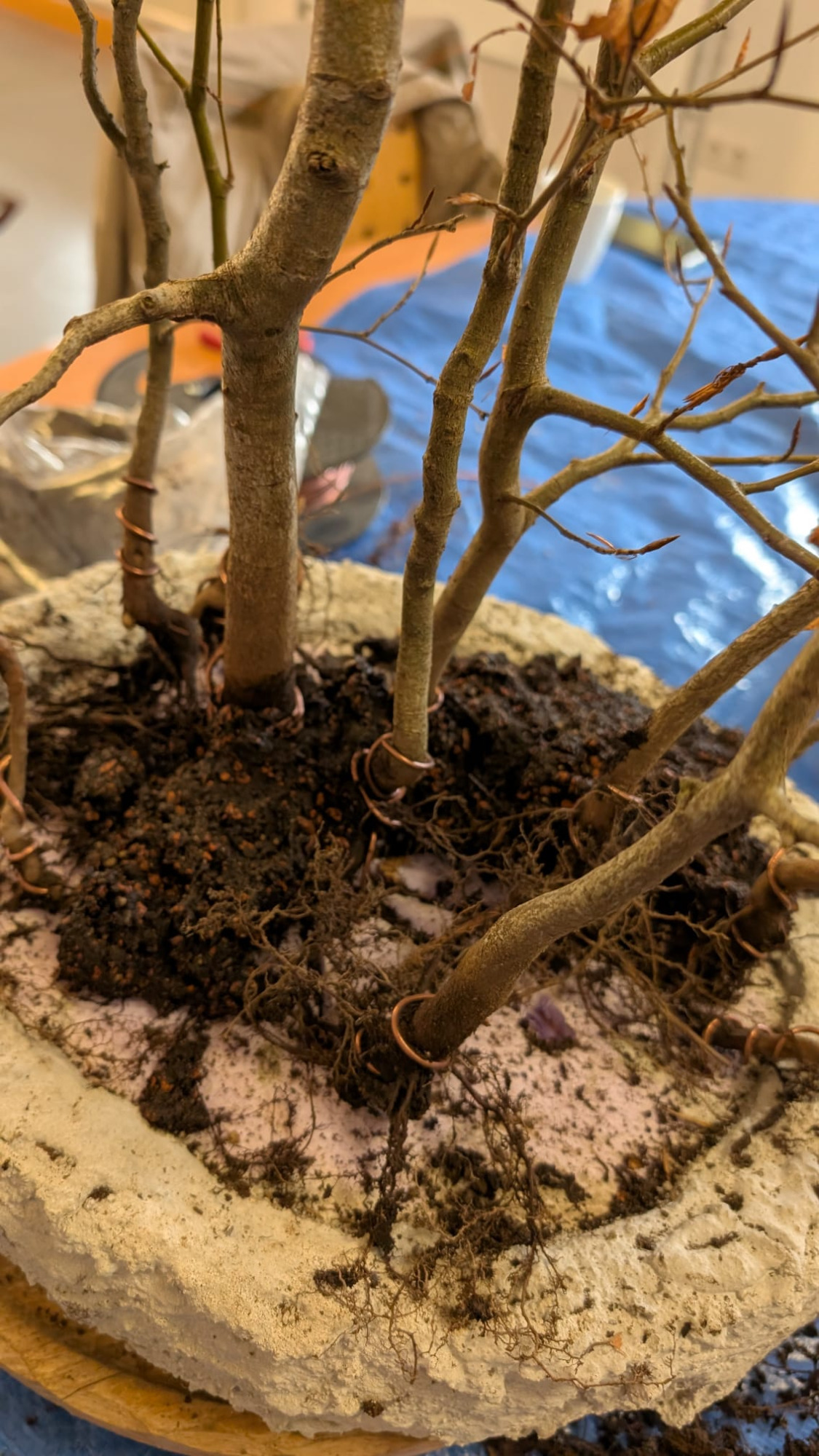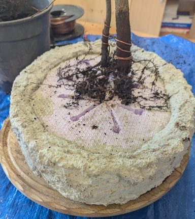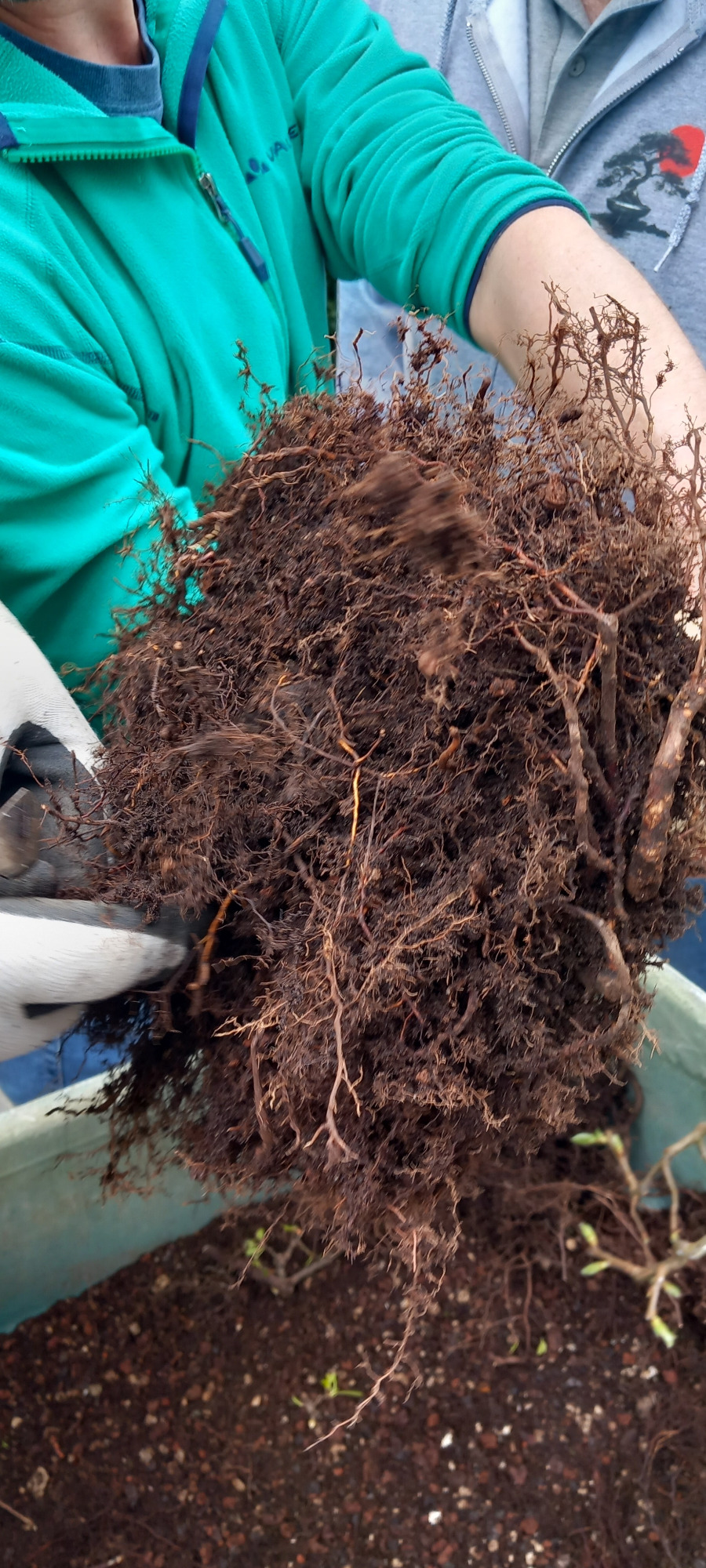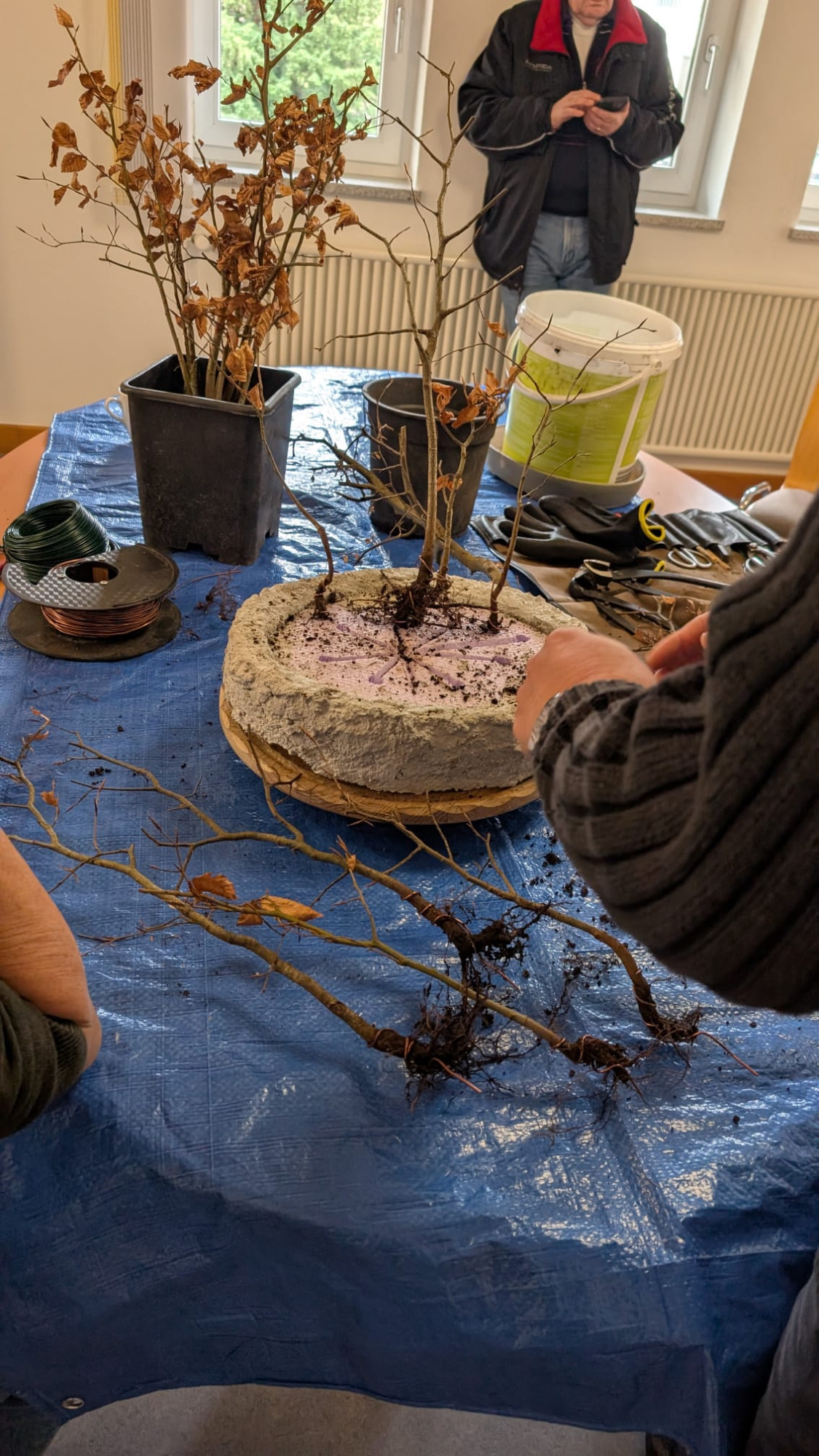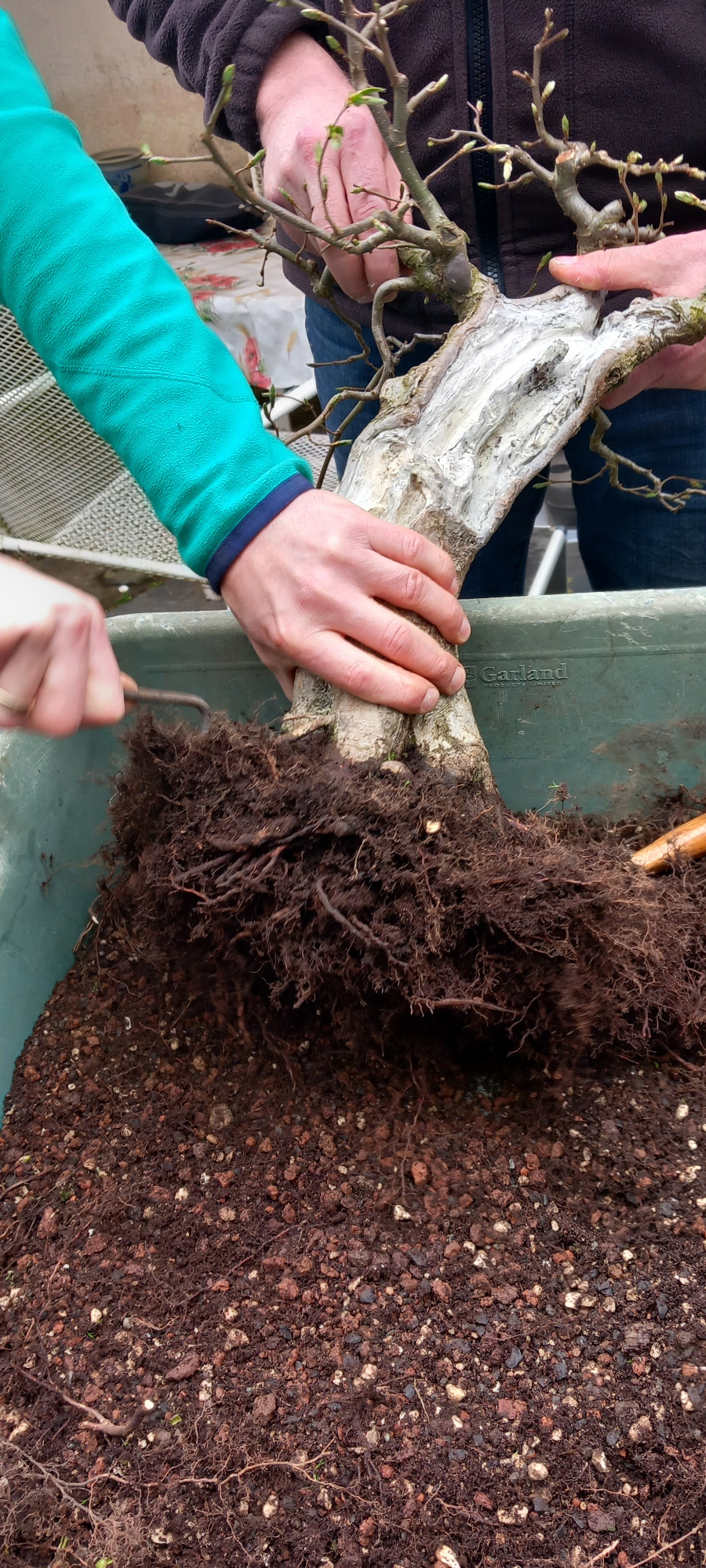Da Egors Schale recht flach war, musste unter dem Stamm auch noch ein dicker Wurzelansatz abgeflacht werden. Die Abflusssiebe hatte Egor schon vorbereitet und so musste nur noch der Befestigungsdraht durchgezogen werden und dann wurde die Schale mit einer dünnen Schicht groben Substrats und darüber mit Feinerem aufgefüllt. Die Hainbuche wurde in die gewünschte Position gesetzt und in das Substrat reingedreht und geschoben. Dabei wurde der feste Sitz geprüft und mit weiterem Substrat an den Rändern stabilisiert. Dann wurden die Drähte verbunden und der Baum festgedrahtet. Weiteres Substrat mit Stäbchen zwischen die Wurzeln gestoßen, um mehr Dichte und Festigkeit zu erreichen, und weiter aufgefüllt, danach noch ordentlich gewässert. Das Umtopfen der großen Lärche von Wolfgang wurde aufgrund des schon stark austreibenden Baums verschoben.