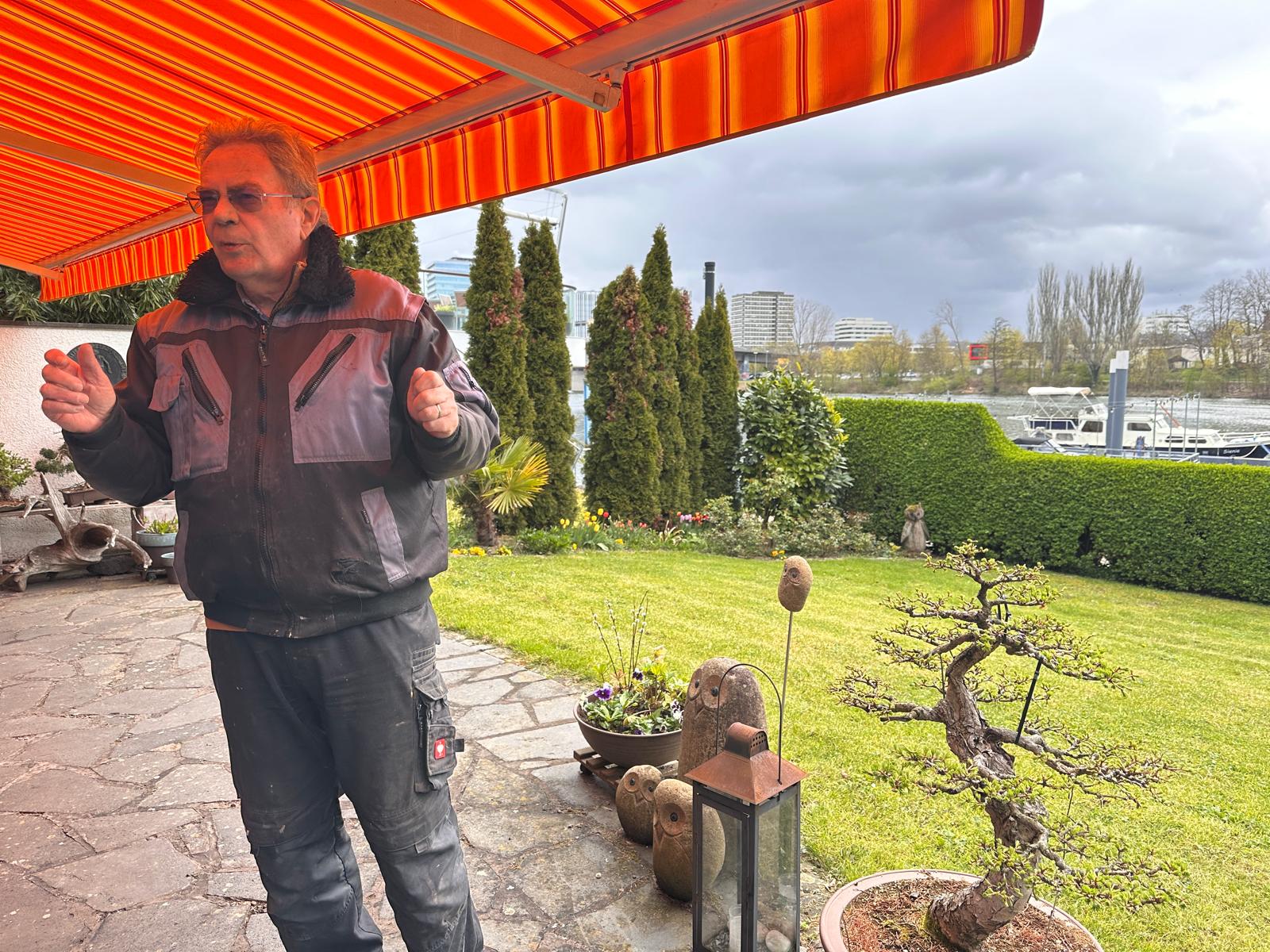 Bernd drahtete seinen Ahorn, um die geplanten Schwingungen zu festigen.