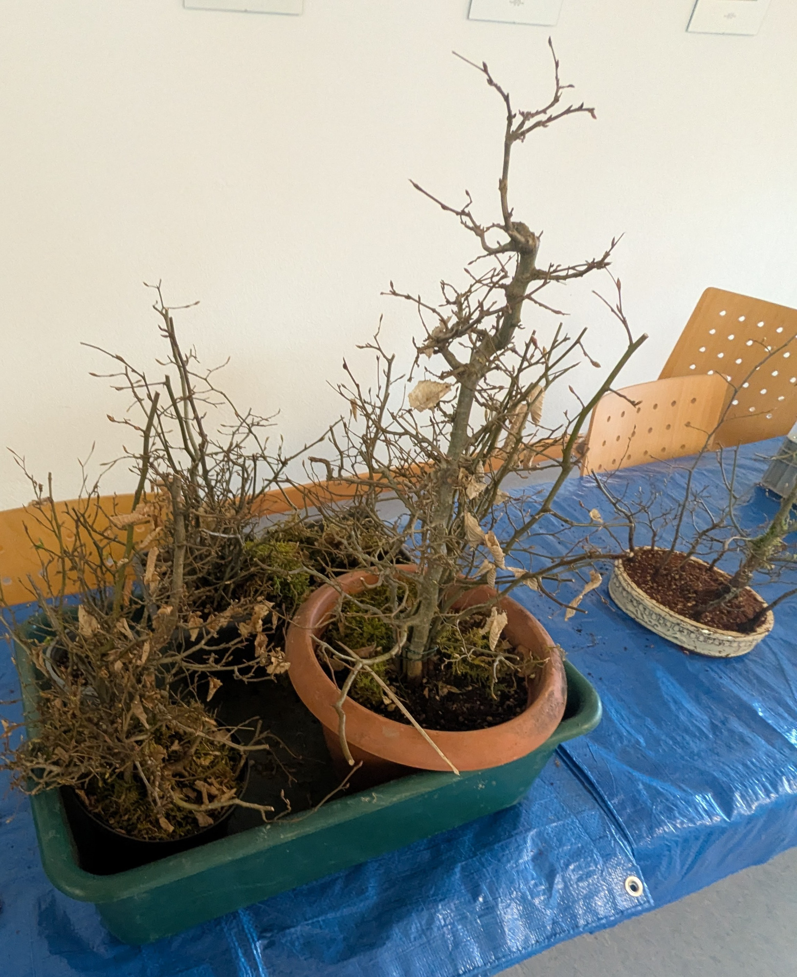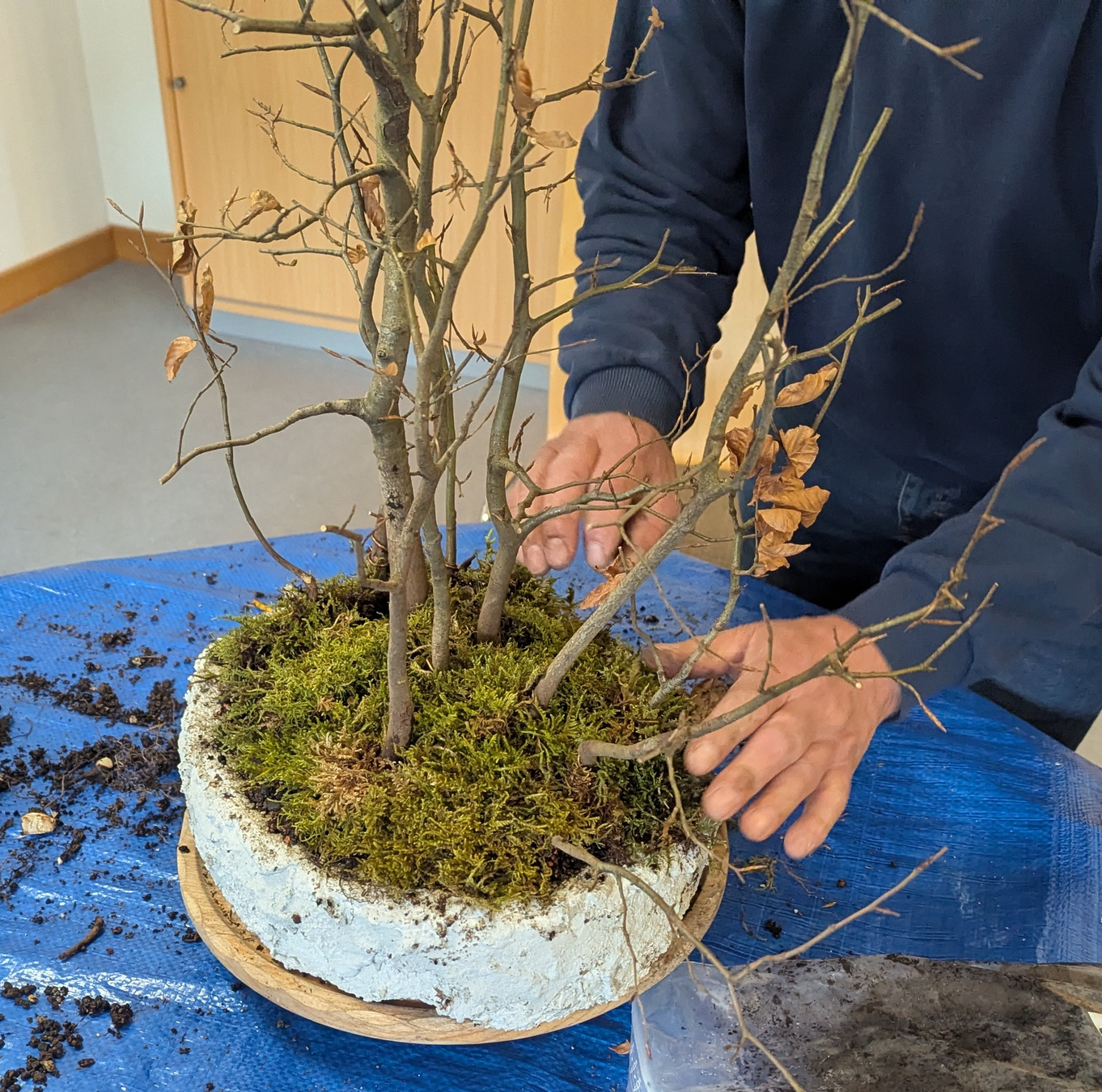 Zur Verfügung standen junge Hainbuchen und Rotbuchen Bäumchen. Um das Anordnen und Positionieren der einzelnen Bäumchen zu erleichtern war ein Styropor -Block in Form einer Bonsai -Schale vorhanden. Die Bäumchen bekamen jeweils einen Draht um den Stamm gewickelt, sodass ein Ende als Spitze unter der Wurzel heraus zeigte. Dadurch konnten die Bäumchen leicht in das Styropor gesteckt, aber auch wieder leicht heraus gezogen und die Position verändert werden.
