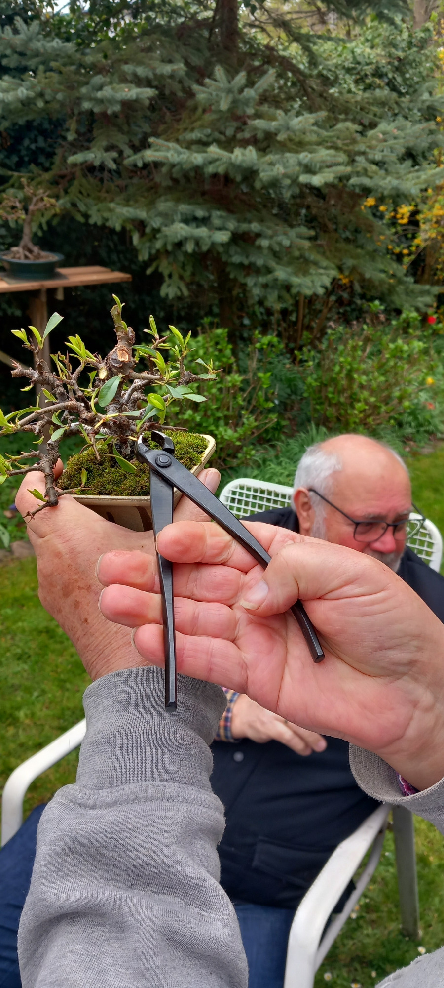 gestern stellte ich meine Hainbuche ,beim Treffen, vor . Es wurde ordentlich diskutiert und auch geschnitten. Die Absichtsseite festgelegt, ein Ast entfernt und die Spitze gekürzt.