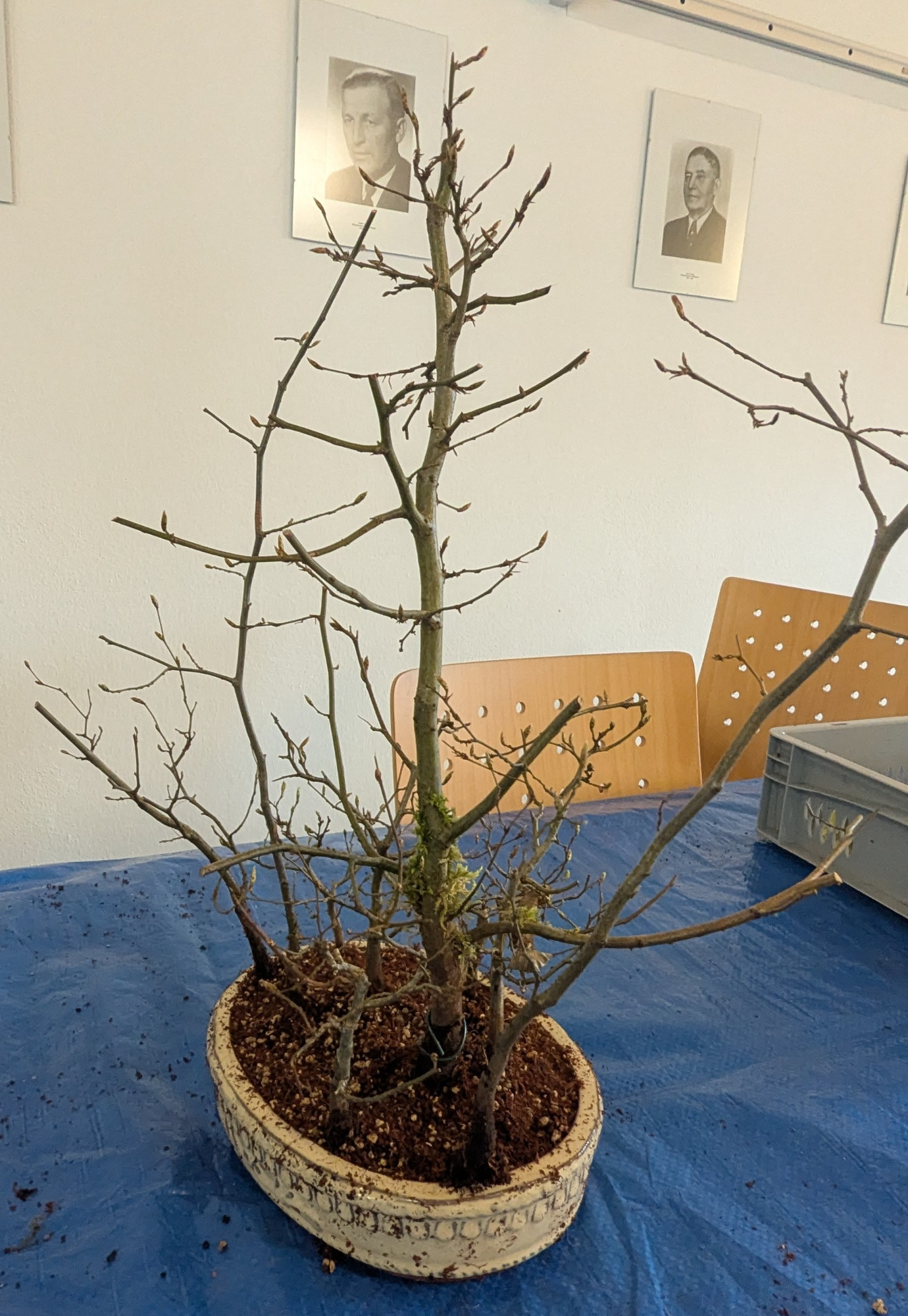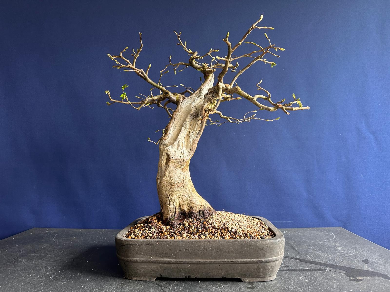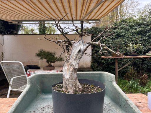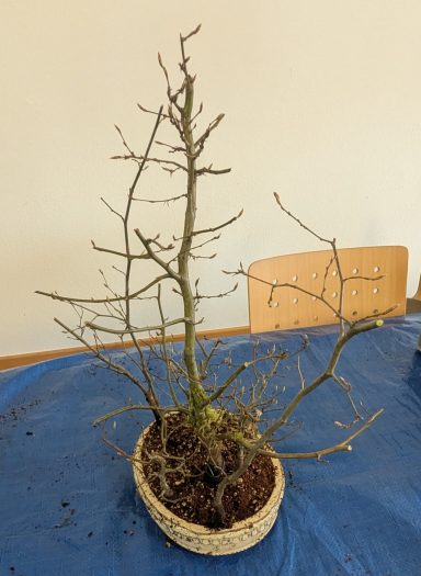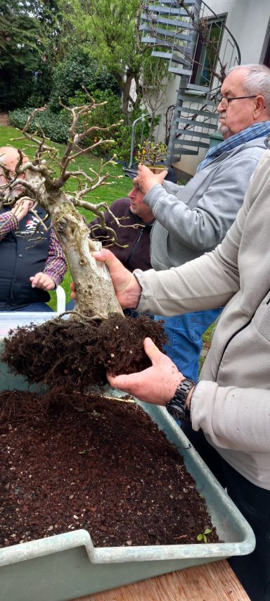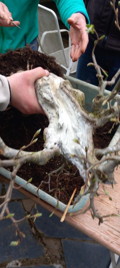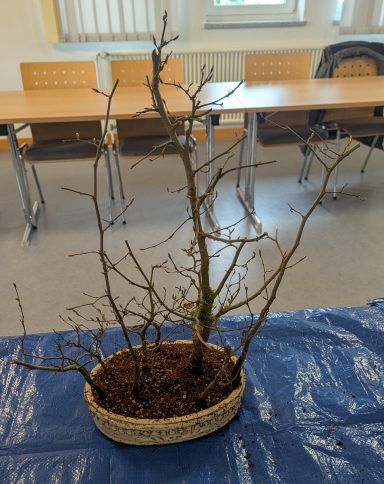Dietmar: Hallo zusammen, unsere Treffen sind nicht nur für euch interessant. Ich profitiere immer stark von euren Feedback. Die Korea-Hainbuche durfte lange wachsen und neue Äste hervor bringen. Nur ein Ast hat keine Seitenäste gezeigt. Weil er als Kandidat für die Ausstellung gesehen wurde, habe ihn mir vorgenommen. Ast ab und den Leerraum etwas auffüllen. Dann eine neue, kleinere, flachere Schale. Ich konnte auch viel von dem Lehmboden herausnehmen.