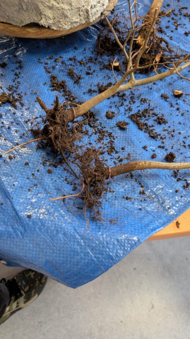 Diese wurde dann umgetopft. Nach dem Rausnehmen aus dem Plastiktopf wurden die Wurzeln freigelegt. Dicke Wurzelstränge unter dem Stamm freigelegt, begutachtet und wenn möglich entfernt. Dieses nahm einige Zeit in Anspruch.