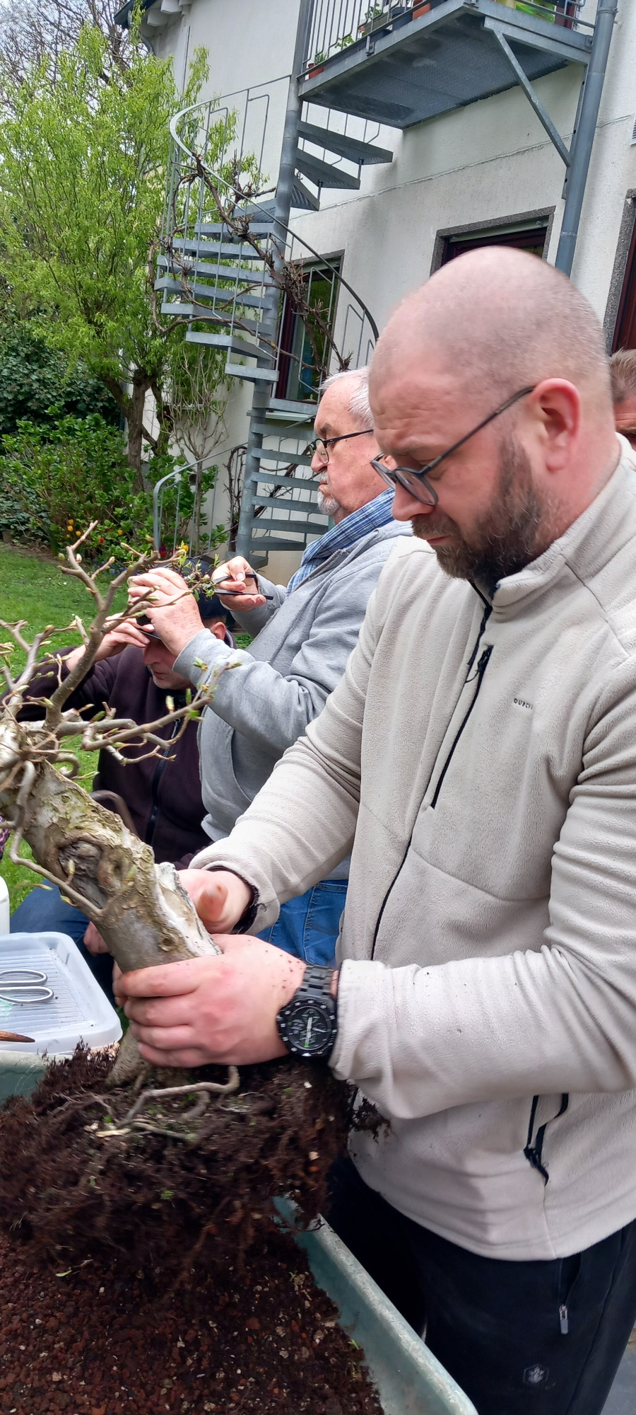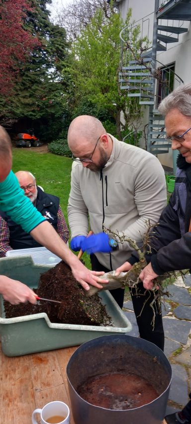 Bei herrlichem Wetter waren wir heute zahlreich bei Dietmar . Udo überraschte uns mit seiner Anwesen und gestaltete eine sehr schöne Lärche. Der Baum wurde zurück geschnitten und dann unermüdlich gedrahtet. Ein großes Thema war abmoosen. eine große Hainbuche wurde gedreht, schräg gesetzt und ausgiebig besprochen. Da an einer Seite nur wenige Äste vorhanden waren kam eine neue Idee auf : eine große Floßform. Der Ahorn von Markus wurde dann zum Abmoosen vorbereitet und später von Marco und Markus Schritt für Schritt durchgeführt. Das war eine tolle sehr genaue Vorführung, da viele dieses noch nicht gemacht hatten. Herzlichen Dank an Marco, der jeden Schritt sehr gut erklärte. Ritas Rot-Buche wurde mit der großen Zange ein Ast in der Krone entfernt und von Dietmar sehr anschaulich gezeigt wie die neue Spitze hochgebogen werden kann. Bernd erklärte ausfühlich den richtigen Zeitpunkt der entsprechenden jahreszeitlichen Maßnahmen wie Düngen - die Wirkung auf den Baum und den richtigen Zeitpunkt des Schneidens. Dann topfte er noch seine gezogenen Ahörner vor. Ein besonderer Dank wieder an Doris, die sehr gut für unser leibliches Wohl und ausreichend Kaffee sorgte.